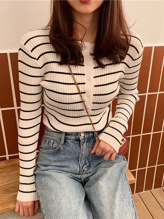 Elegantes gestreiftes Strick-Damen-T-Shirt mit geknöpften langen Ärmeln für Herbst/Winter