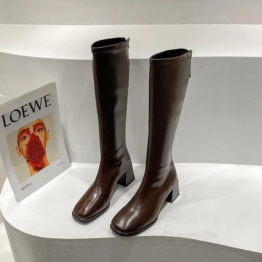Bottes longues à talons hauts en cuir souple d'hiver pour femmes