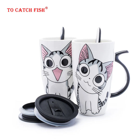 Tasse en céramique créative pour chat de 600 ml avec couvercle et cuillère