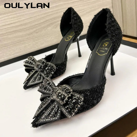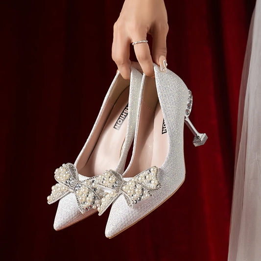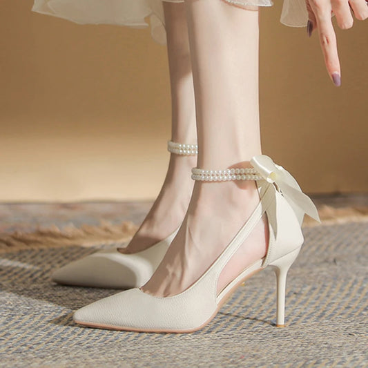 Sandales d'été pour femmes à bout pointu et talons hauts ornés de perles et de nœuds