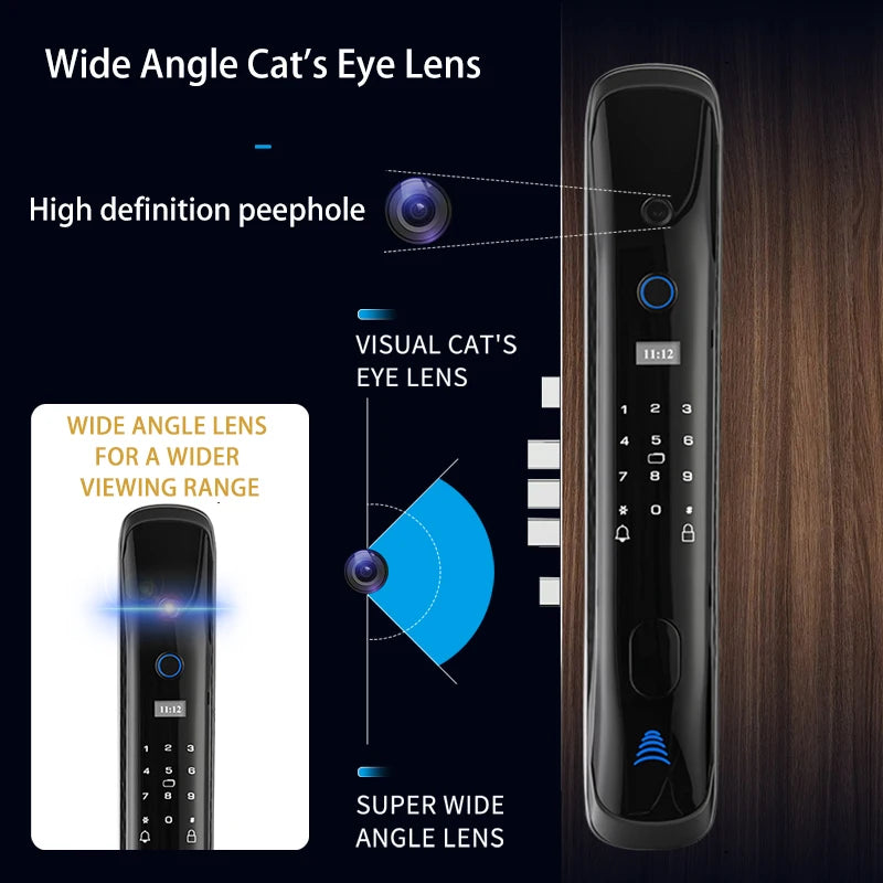 Améliorez votre sécurité avec la nouvelle serrure de porte intelligente biométrique à empreintes digitales. Doté d'options de mot de passe, de clé, de carte IC et de déverrouillage d'application, ce verrou électronique comprend également une caméra intégrée. Parfait pour les maisons modernes, il allie commodité et protection avancée.