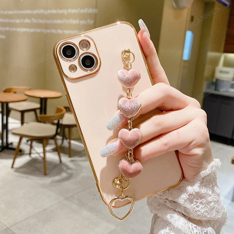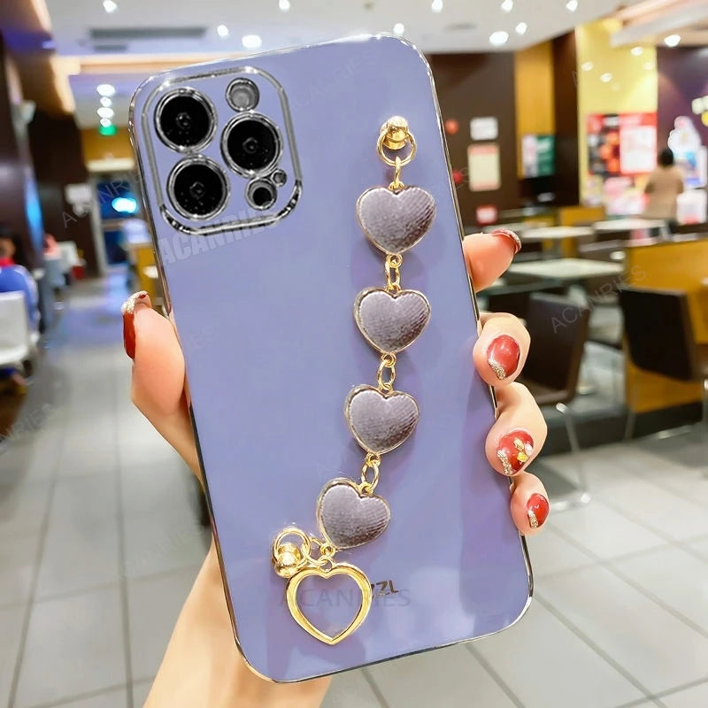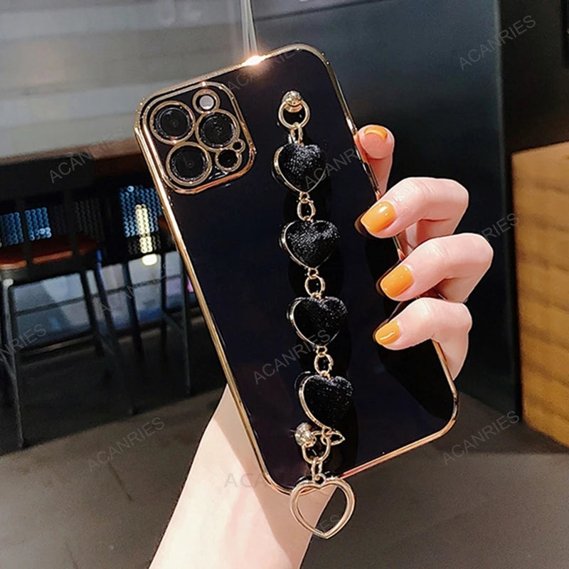 Étui de chaîne de bracelet de coeur d'amour de placage de mode pour iPhone 15