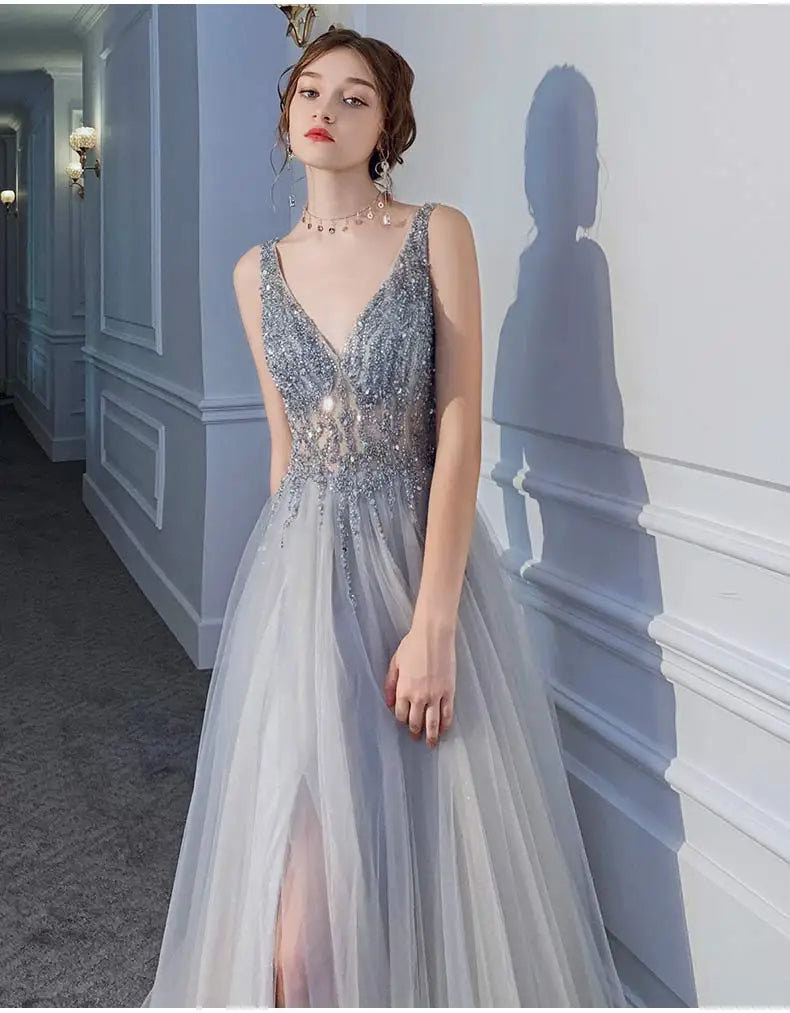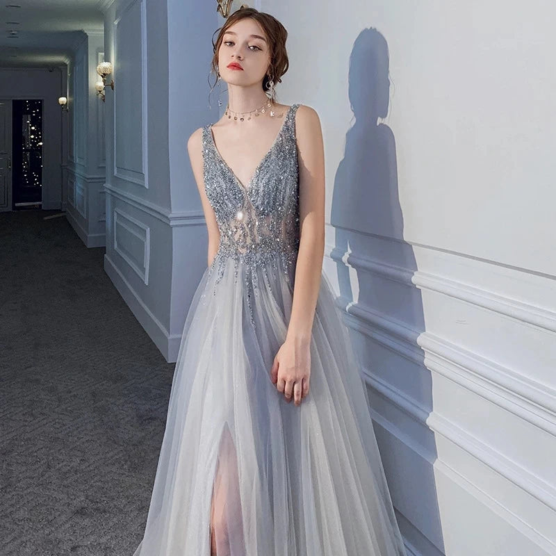 Faites tourner les têtes avec cette superbe robe de soirée formelle à col en V à bas prix. Dotée d'un design dos nu orné de perles et de paillettes, cette robe en tulle présente une fente latérale sexy, parfaite pour les bals de fin d'année, les mariages et les événements formels. Faites l'expérience de l'élégance et du charme dans cette robe exquise, conçue pour vous faire briller lors de votre soirée spéciale.