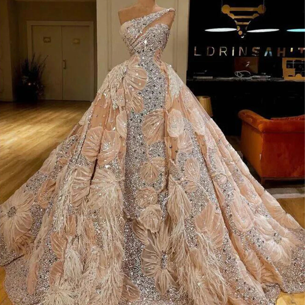 Entrez sous les projecteurs avec cette opulente robe de bal de luxe 2024. Dotée d'un superbe design à une épaule, orné de perles de cristal complexes, de paillettes et de plumes délicates sur du tulle chamgape, cette robe sans manches respire le glamour et la sophistication. Parfait pour les soirées formelles, il promet de faire sensation et de laisser une impression durable.