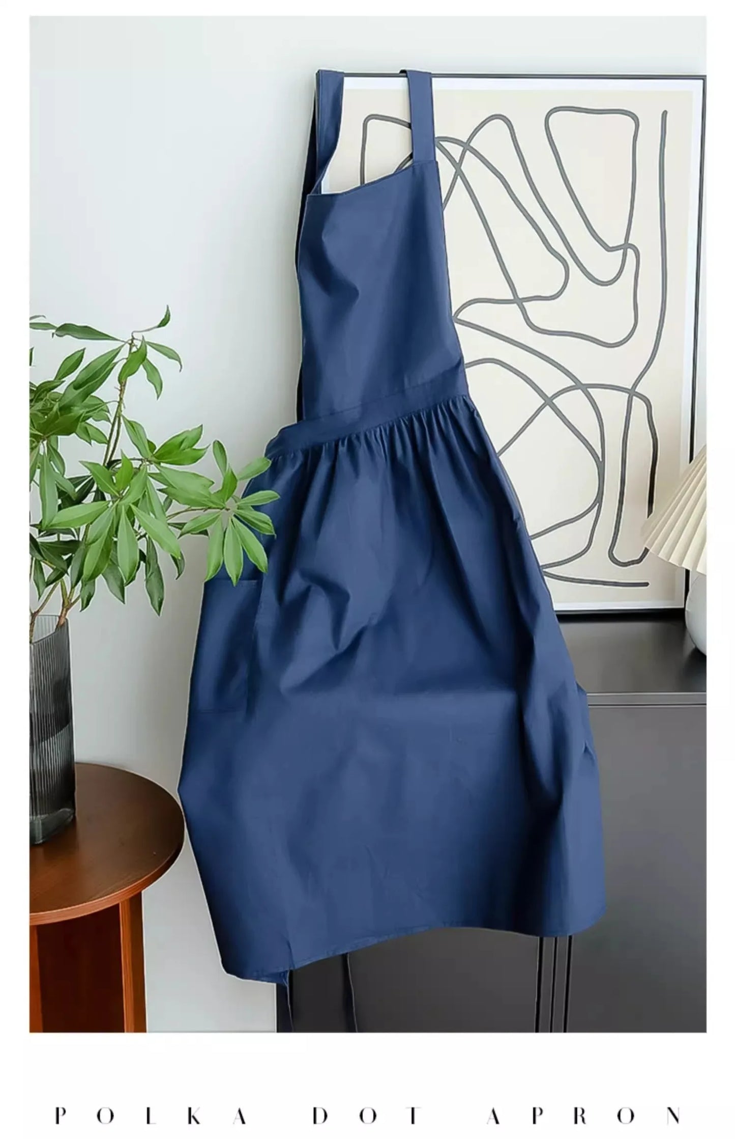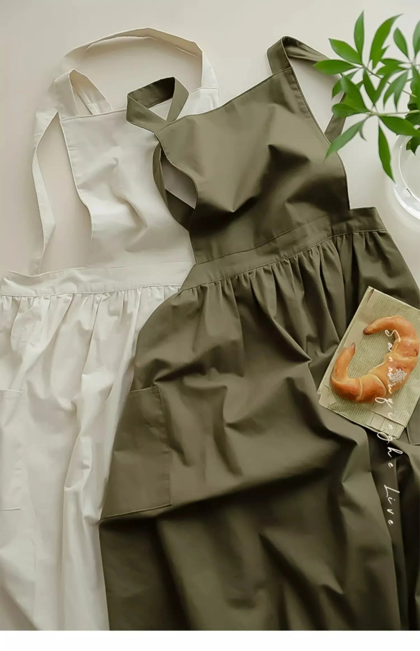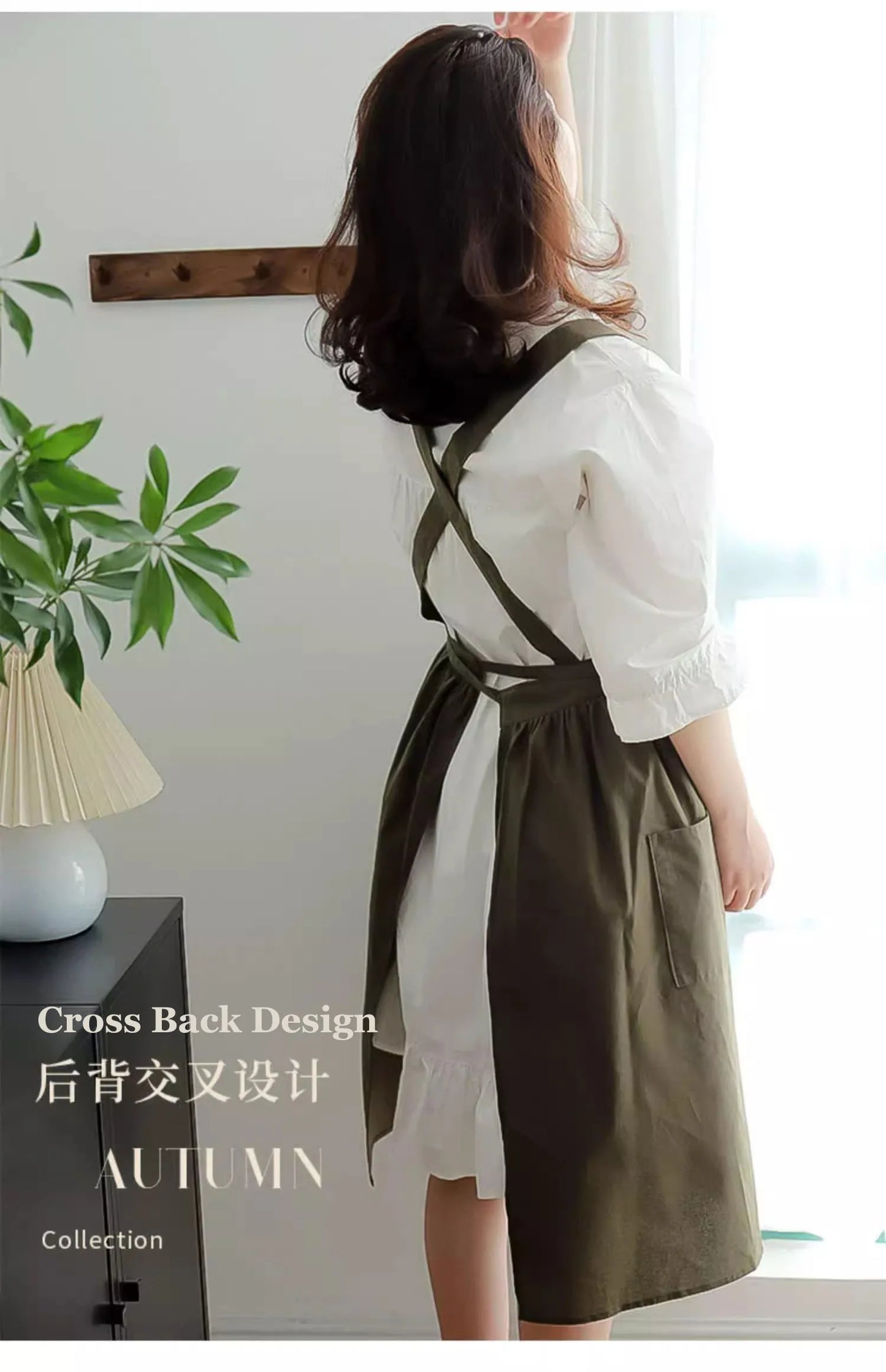 - Simple and stylish design style. The design of the folding skirt gives this apron elegance and tenderness. The cross-back design makes this apron no longer slip from the shoulder. 2 large front pockets add more practicality to this apron.