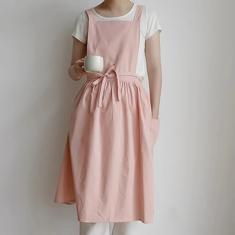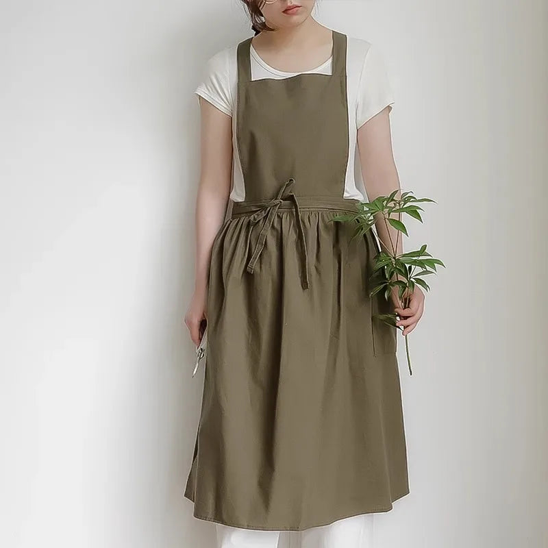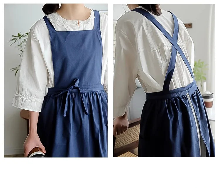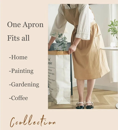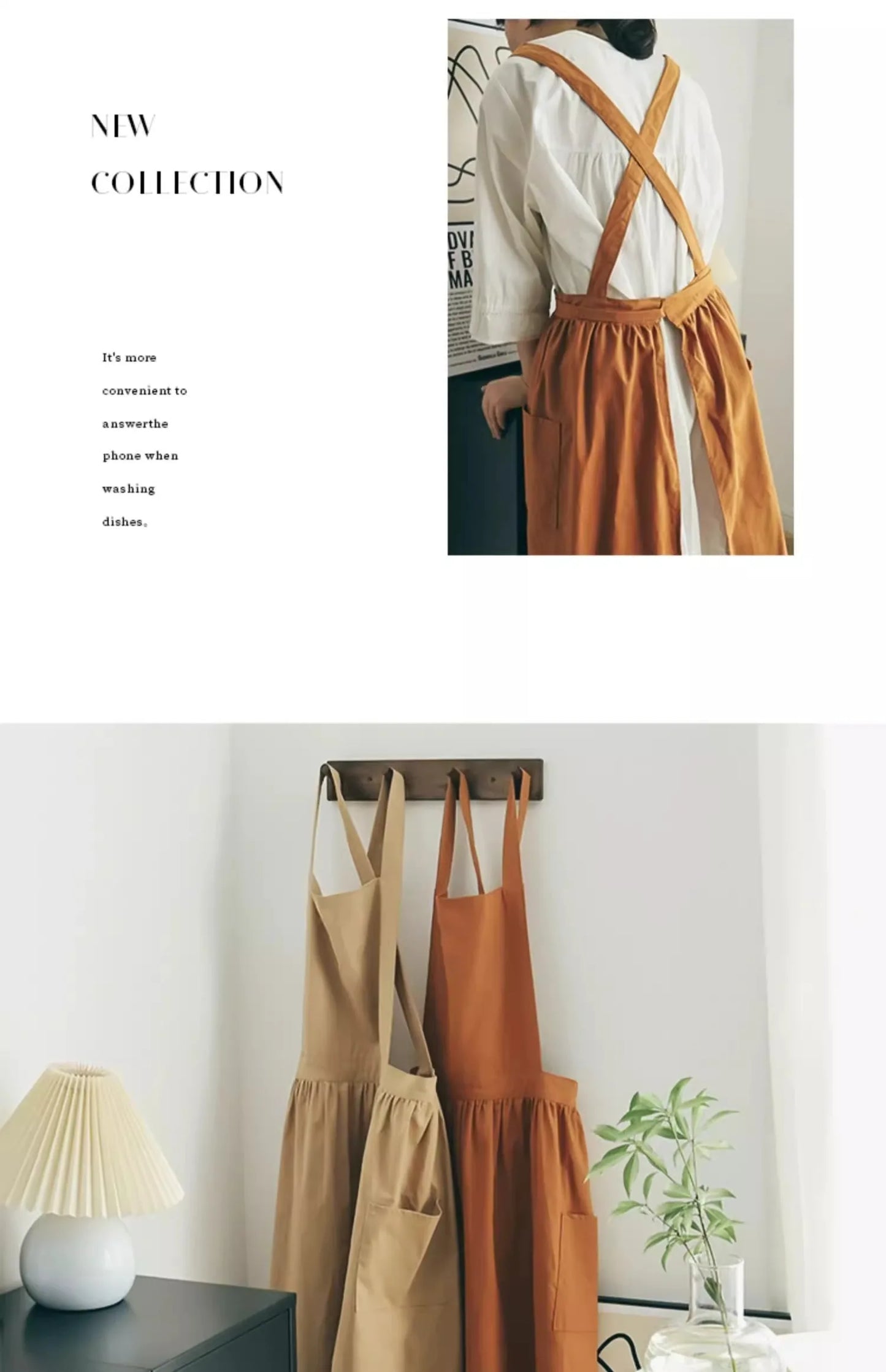 - Simple and stylish design style. The design of the folding skirt gives this apron elegance and tenderness. The cross-back design makes this apron no longer slip from the shoulder. 2 large front pockets add more practicality to this apron.
