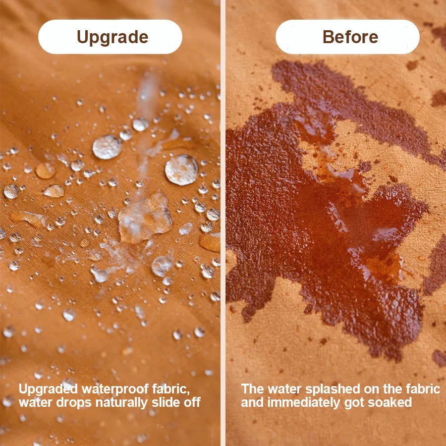 - Fabric: Waterproof Cotton. The fabric of this apron is comfortable and skin-friendly, breathable. Using the latest sewing process, the needle thread is neat and dense, durable.