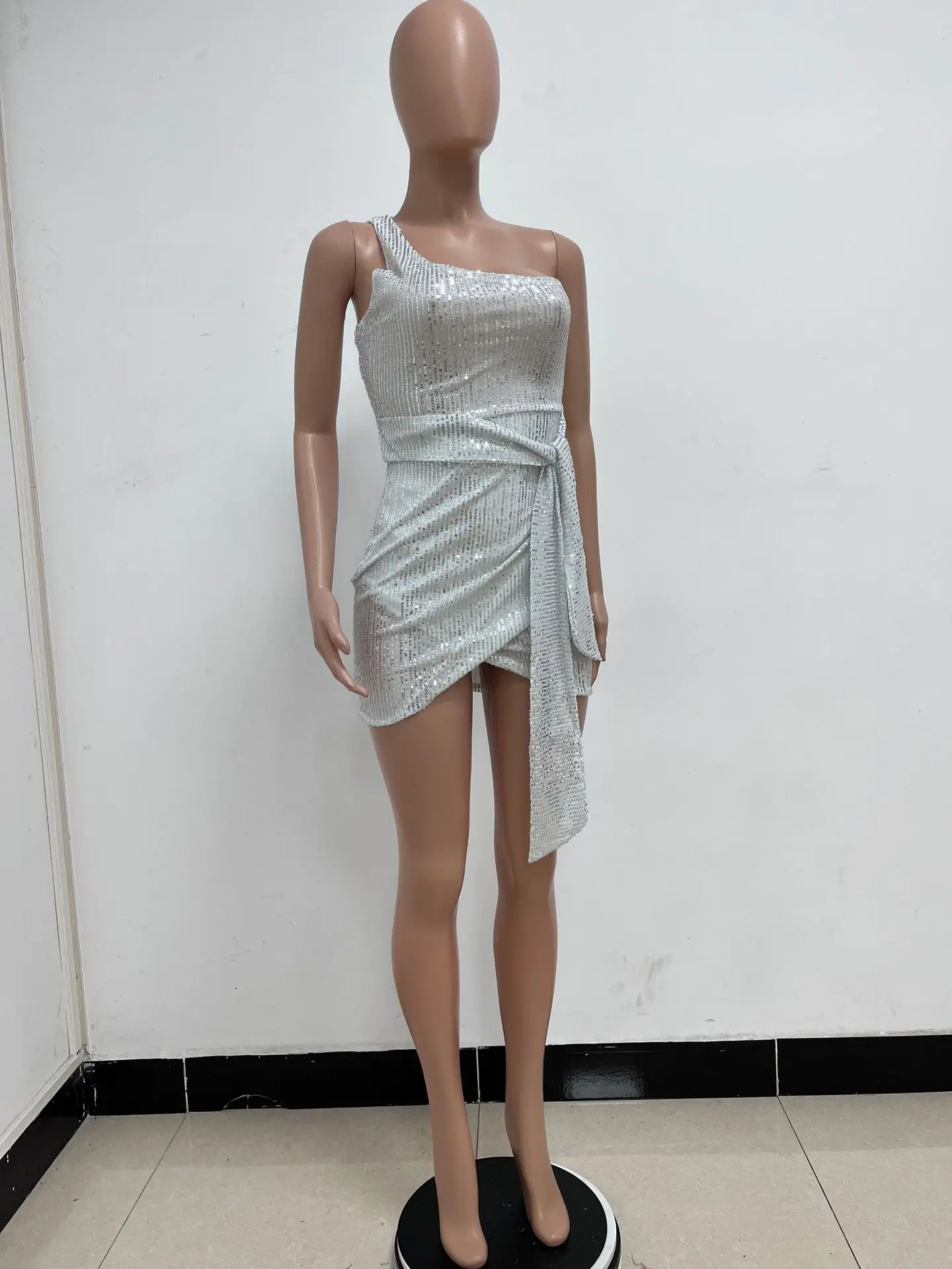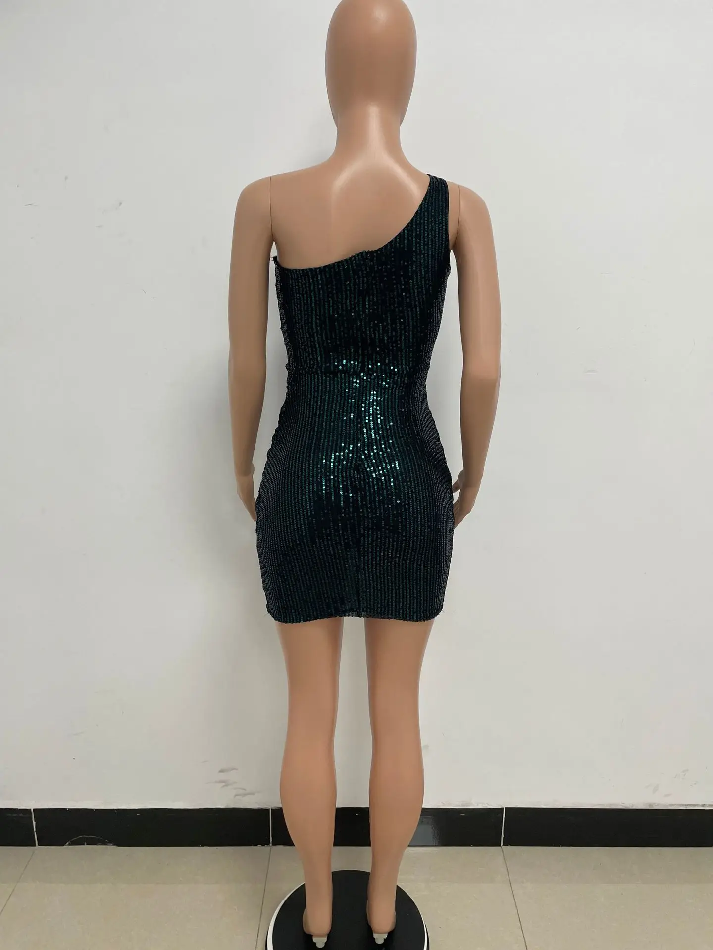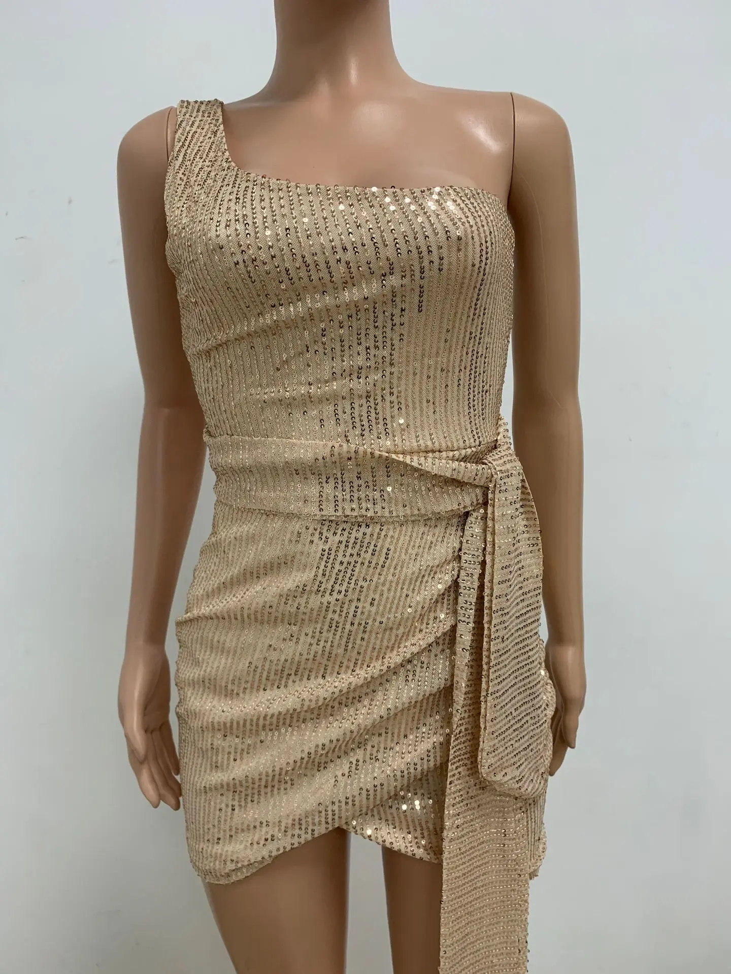Radiate sophistication in this elegant one-shoulder sequin evening dress. With its asymmetrical draped design and sleeveless silhouette, it exudes allure and style. The backless detail adds a touch of sensuality, perfect for proms or any glamorous party. Step into the spotlight with confidence and grace in this stunning short gown that promises to make heads turn.