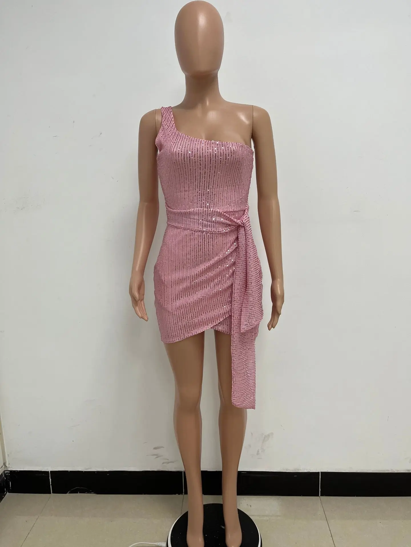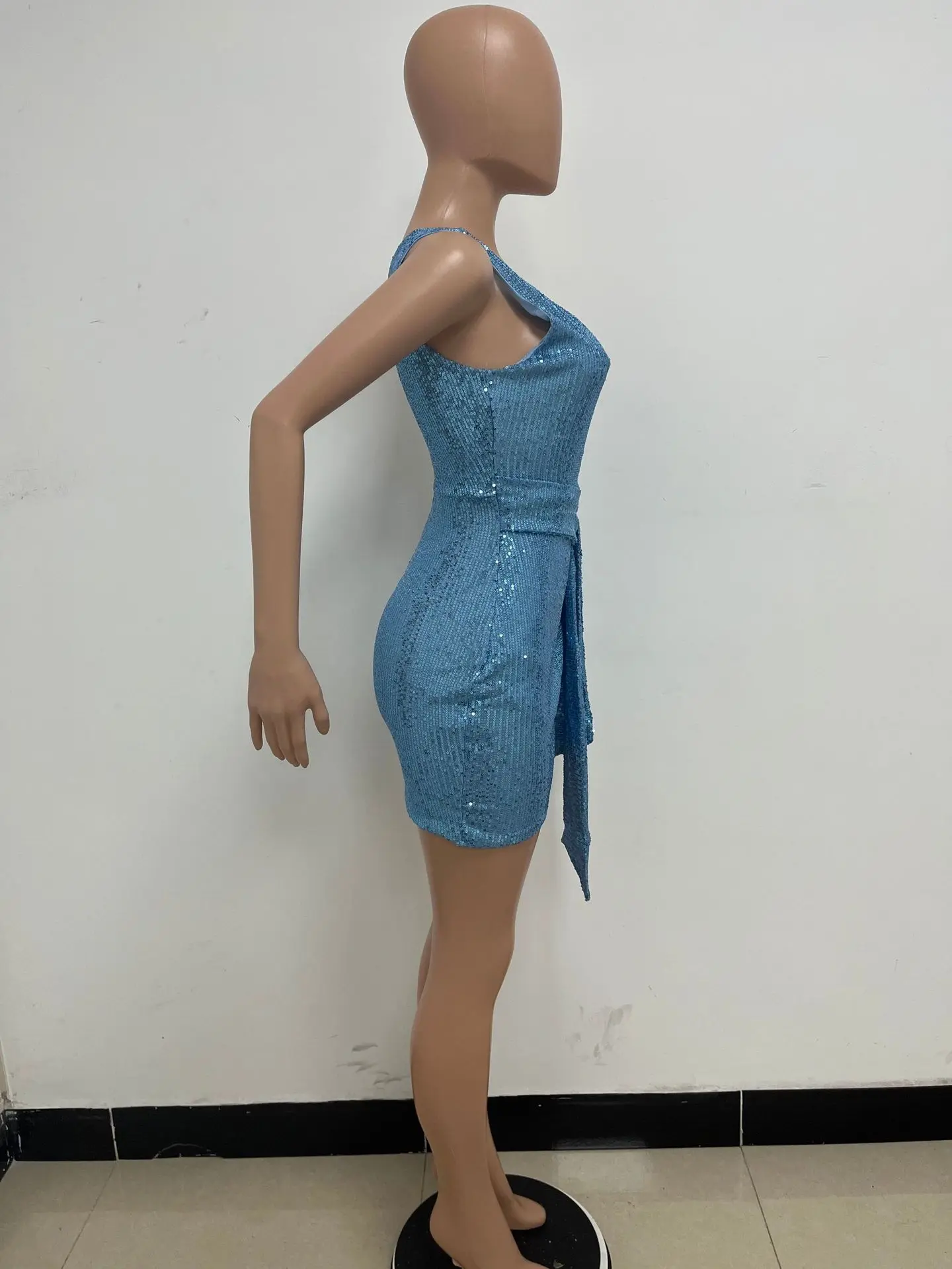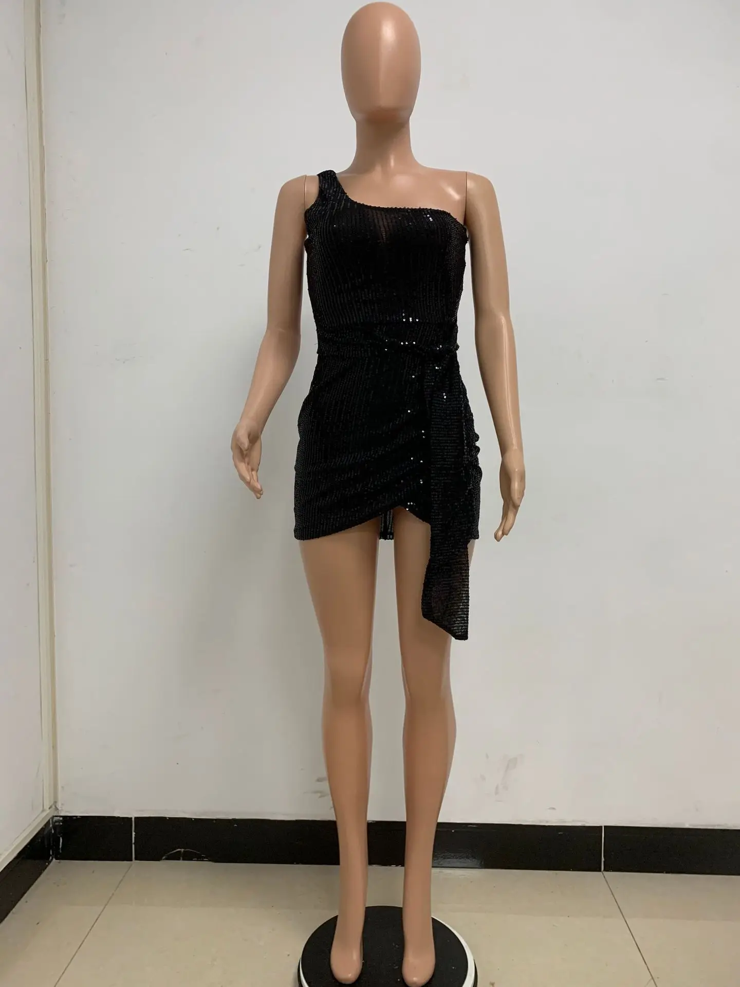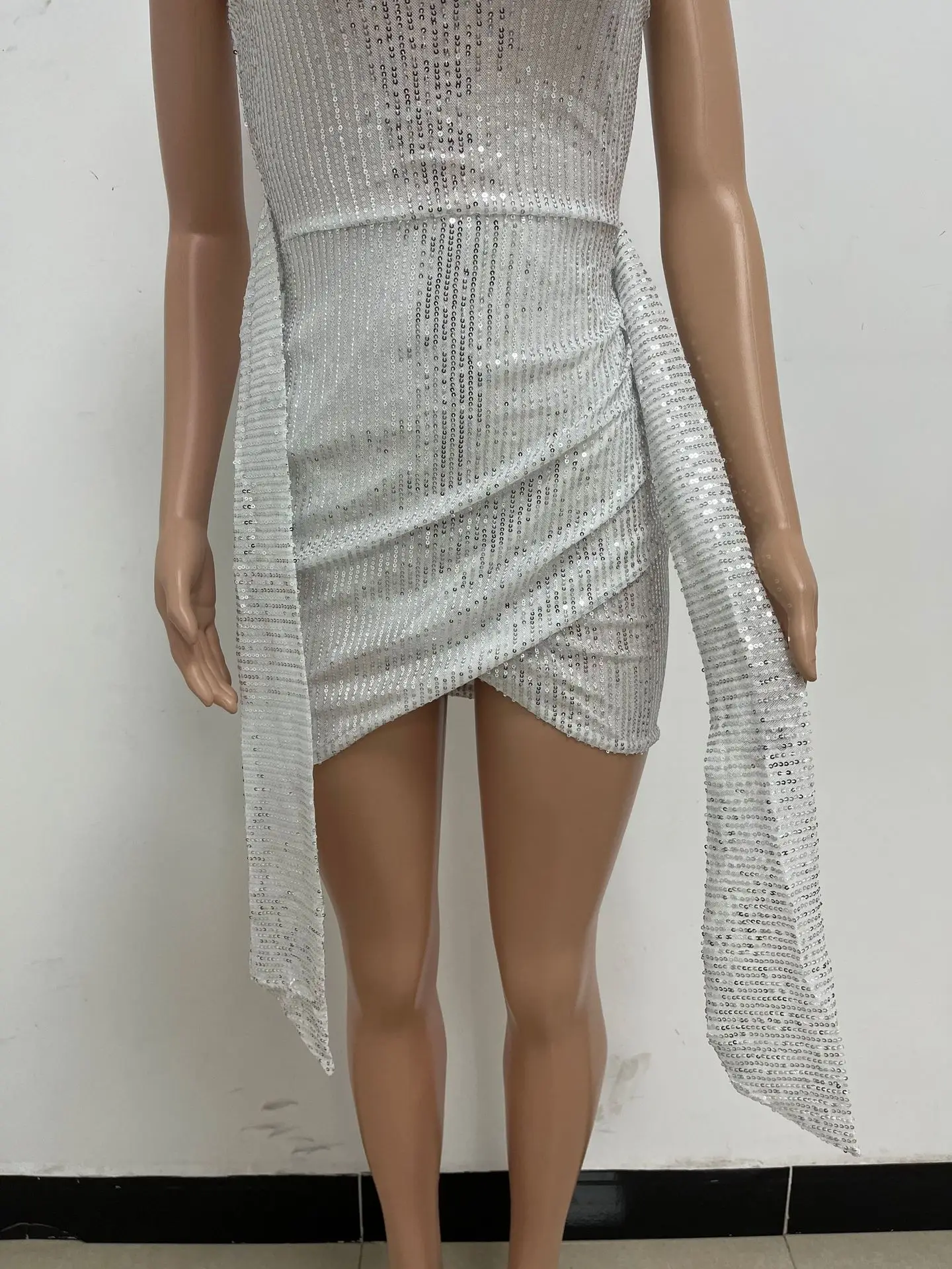 Radiate sophistication in this elegant one-shoulder sequin evening dress. With its asymmetrical draped design and sleeveless silhouette, it exudes allure and style. The backless detail adds a touch of sensuality, perfect for proms or any glamorous party. Step into the spotlight with confidence and grace in this stunning short gown that promises to make heads turn.