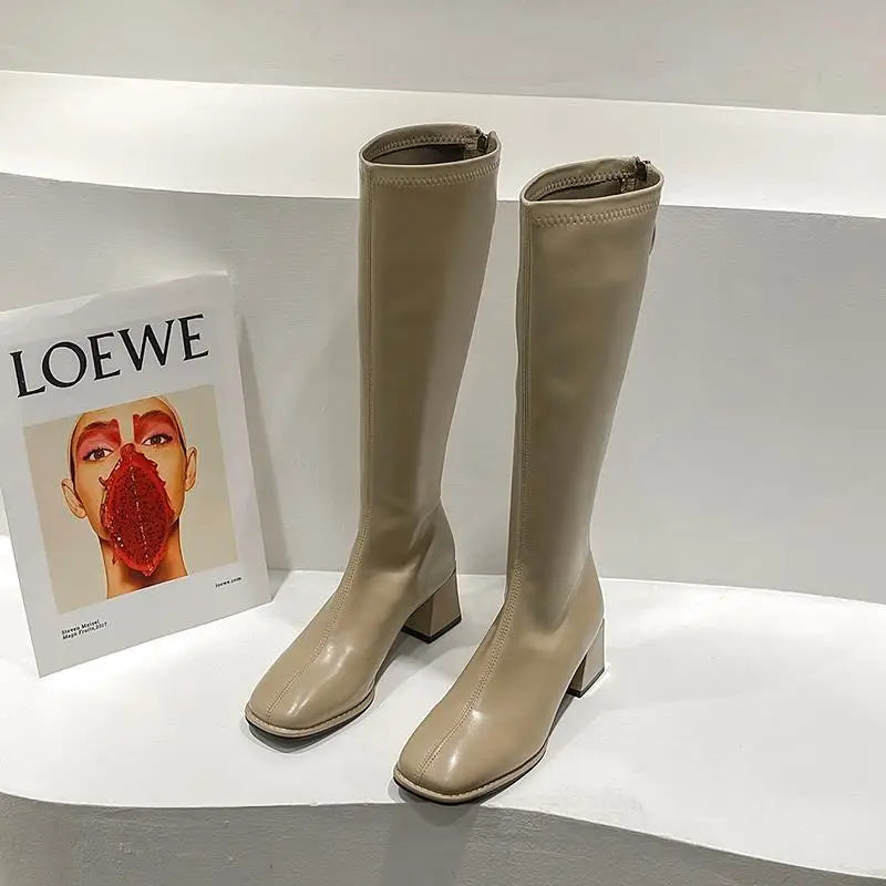 Autumn Winter Women Thigh High Long Boots High Quality Soft Leather Ladies Pumps Elegant Square Toe Knee-High Boots Shoes